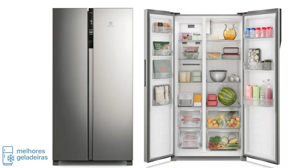 No refrigerador Side by Side, as portas se abrem como um guarda-roupa: freezer à esquerda, refrigerador à direita. Essa divisão vertical permite acomodar enormes volumes sem exigir profundidade exagerada. Modelos atuais chegam a 600 L, com proporção de 40 % freezer e 60 % refrigerador.