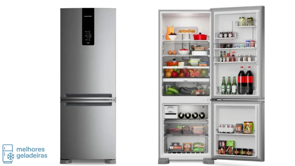 O modelo costuma oferecer gavetas deslizantes no congelador, iluminação em LED de baixo consumo e, em muitos casos, compressor inverter, que modula a rotação evitando picos de energia. Jefferson aponta no vídeo que “o ruído médio cai de 45 dB para 38 dB em linhas premium”, ideal para cozinhas integradas à sala.